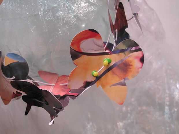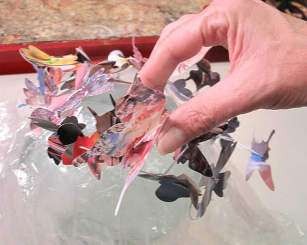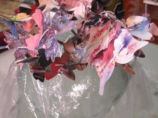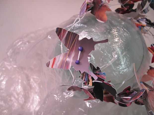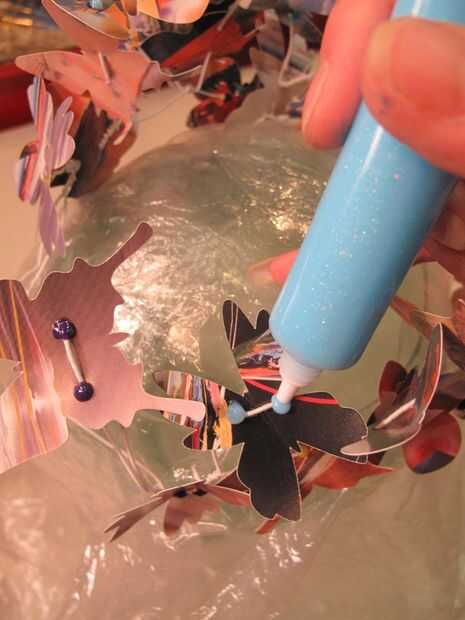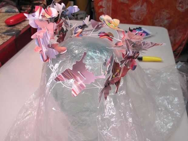 Después he creado la forma que yo quería, necesitaba pintar más. Puse una lámina de plástico sobre la forma de la cabeza (no una buena idea si usted está usando un modelo vivo!) para no recibir pintura en él. Seguí a dejar caer gotas de pintura en los agujeros hasta que hubiera hecho las mariposas.
