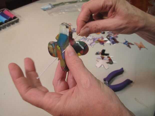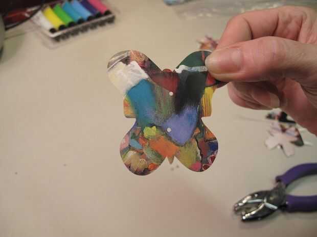 Usando la perforadora de papel, perfora 2 agujeros en las mariposas. No tengo la silueta cortarlas así podía decidir donde quería como creé la guirnalda.