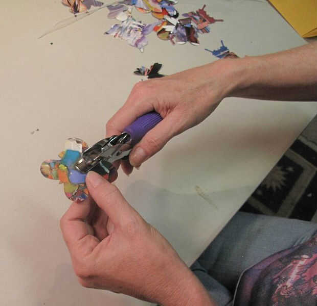 Fui buscando un golpe con un orificio muy pequeño, ya que quería el agujero cerca del tamaño del alambre. Encontre uno en mi tienda de artesanía local. Ya que se pega las mariposas en su lugar, puede utilizar un golpe con un agujero más grande si quieres.