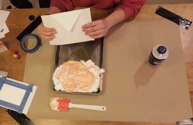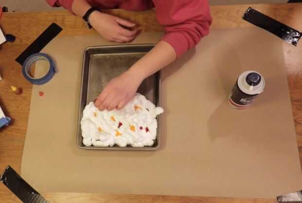 Cubrir la bandeja en una capa de crema de afeitar. Luego, añadir unas gotas de colorante alimentario a la crema de afeitar. A continuación, tome la espátula o la selección de diente y el colorante alimentario de la mezcla con la crema de afeitar. Utilizar la selección de diente cuando quiero crear más de un patrón. Utilizando la espátula creará más de aspecto jaspeado.