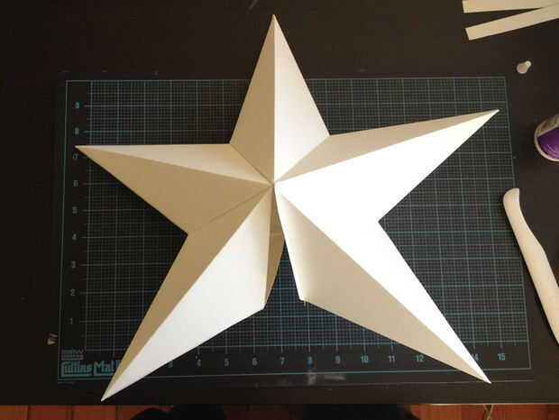 Con las piezas de listas, Aplique pegamento en la parte superior de las dos aletas que están ahora fuera de la parte inferior de la punto de la estrella. Conecte el punto de la estrella al siguiente punto de estrella, como sen en la segunda foto y junte hasta que el pegamento mantiene juntos. Repetir hasta tener 5 piezas todos juntos, como en el tercer cuadro.