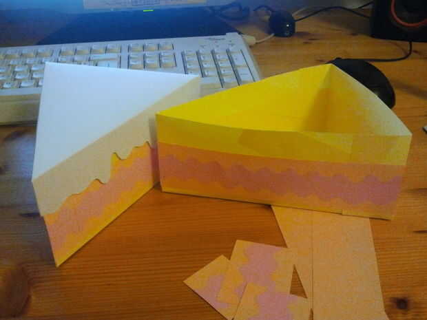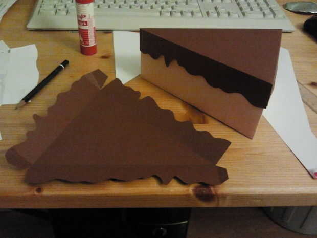 Al principio necesita un número de piezas, 8 (o 16) es la solución más fácil porque obtienes el ángulo doblando un papel doble (o triple). Usar construido o ángulo caclulated para construir su área básica (triángulo equilátero, aquí 18cm ambos lados) de un proyecto. Elegir una altura de torta (aquí 7cm) y aplica al sótano. Luego a la misma con un poco más grande triángulo (lados de 18, 5cm, borde de 3cm) para el techo. Para tener una impresión del tamaño.
