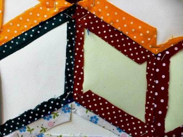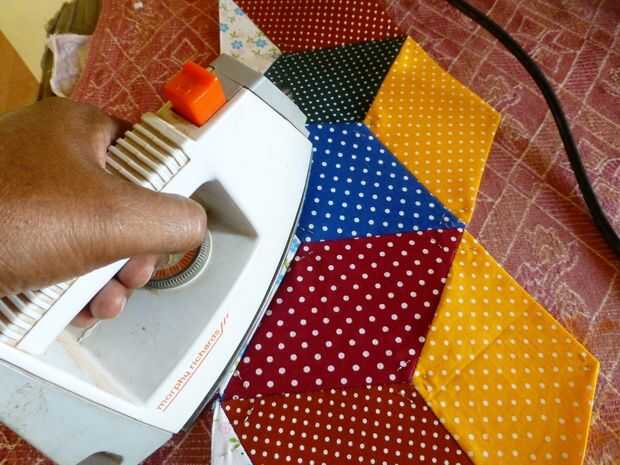 Puede proceder a coser todas las piezas juntas uno por uno según diseño. Presione hacia abajo de cada unión con hierro caliente después de coser. (No pasar las piezas de la prensa, simplemente presione hacia abajo)