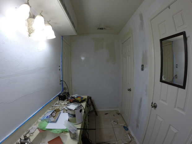 He encontrado dos métodos en línea para la reparación de la mampostería seca. Varios dijeron que pintar con una pintura/sellador a base de aceite, entonces use compuestos para juntas de panel de yeso para rellenar y suavizar las zonas ásperas. Otros dijeron que sólo utilizan el compuesto para junturas. Decidí que puesto que yo cubriendo algunas de las paredes con la madera contrachapada, no importaba si eran ásperos, pero tendrían que ser sellado de la humedad. Por lo tanto, he sellado todos los puntos desnudos con un yeso sellador/imprimador y utiliza conjuntas compuesto para suavizar las asperezas en las dos paredes que planeaba pintar.