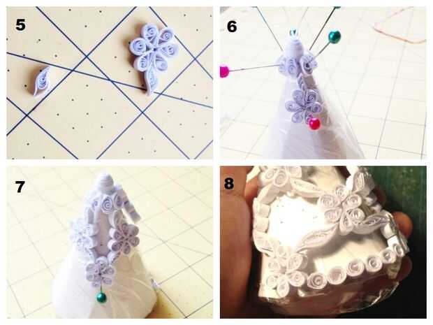 Ahora pega y pin 8 pétalos alrededor del punto más alto. Coloque el cono con la cadena en la parte superior. y el pegamento.