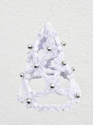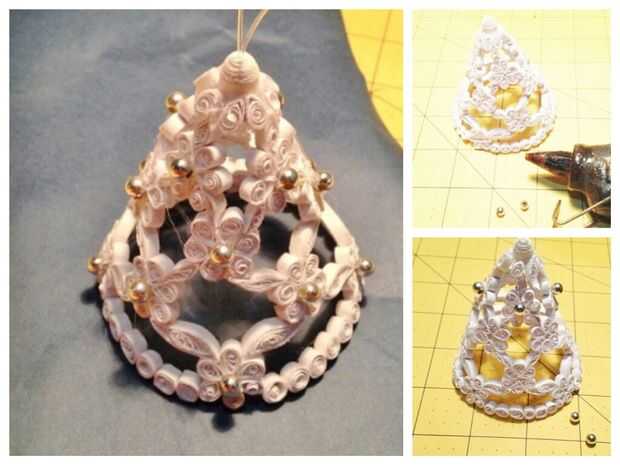 Corte 1 tira larga de papel y el rodillo para formar un cono. colocar en la parte superior del cono y lentamente empuje para formar un cono. Asegurar la línea de pesca para colgar en este, como hicimos para el muñeco de nieve.