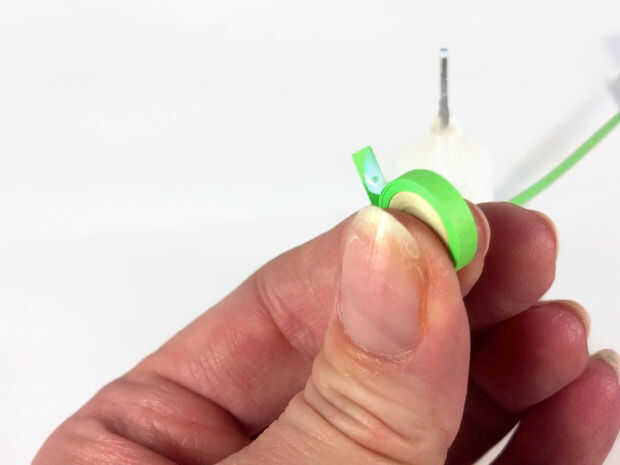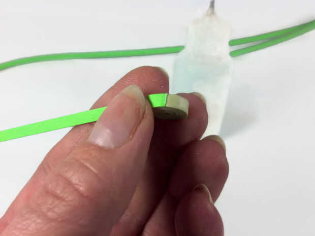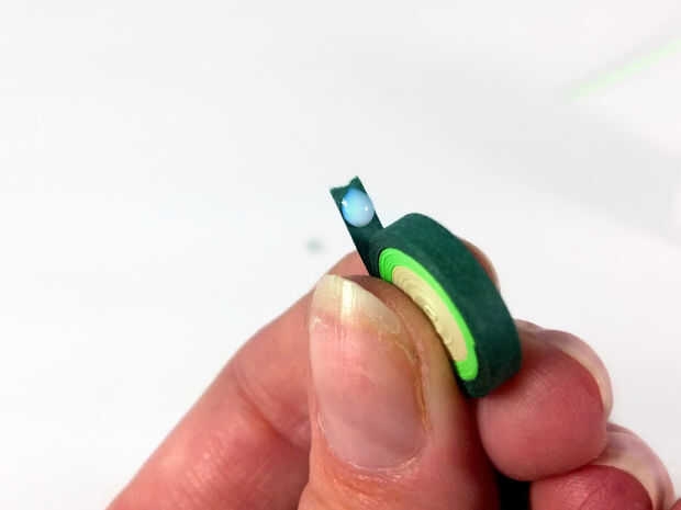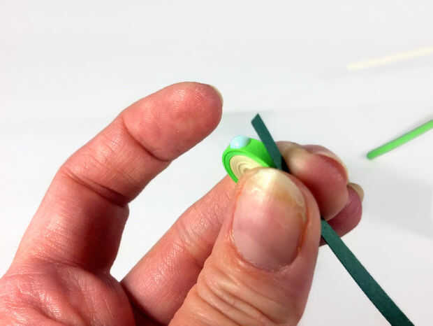 Pegue la siguiente tira en su bobina. Intentar ser aseado, colocar la segunda tira directamente al lado de la final de la primera tira. La segunda tira alrededor de la bobina del rodillo y fíjelo con un poco de pegamento. Repetir con la tercera franja. Ahora debe tener algo que se asemeja a la foto de arriba.