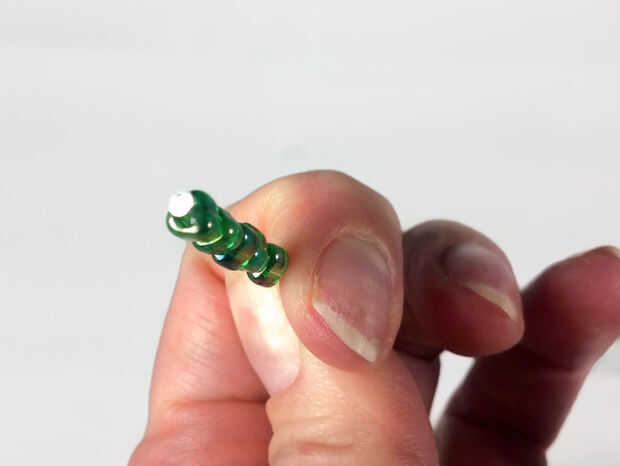 Cadena bolas en sus pernos de joyería. Usar su juicio en cuanto a cuántos granos de usa. Asegúrese de que la cabeza del perno es más grande que los orificios en los granos para que no caigan! He utilizado bastantes granos asi que solo se leerlo fuera de la base.