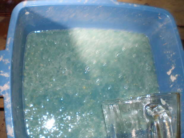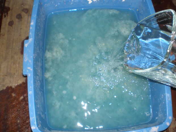 Este es quizás el paso más fácil porque todo lo que necesitas hacer es verter la pasta en la cubeta estanca y agregue varios galones de agua. No importa si es agua tibia o fría esta vez. El agua ayudará a hacer su papel más plano y más delgado. Pero cuidado, porque si pones demasiada agua su papel puede: ser muy delgadas, tienen agujeros, o difícil de secar. Después dé la mezcla una agitación rápida.