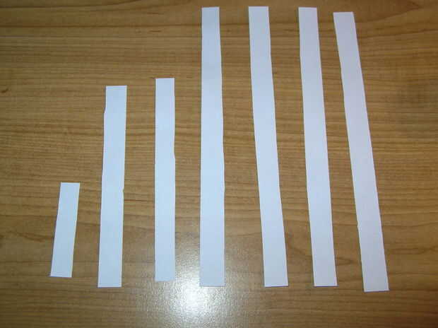 Estas son las bandas que usted terminará para arriba con. Mantuvo 4 bandas completas y cortar otros 2 a la 3/4 de la longitud. La banda pequeños es la parte que corté de la banda de 3/4.