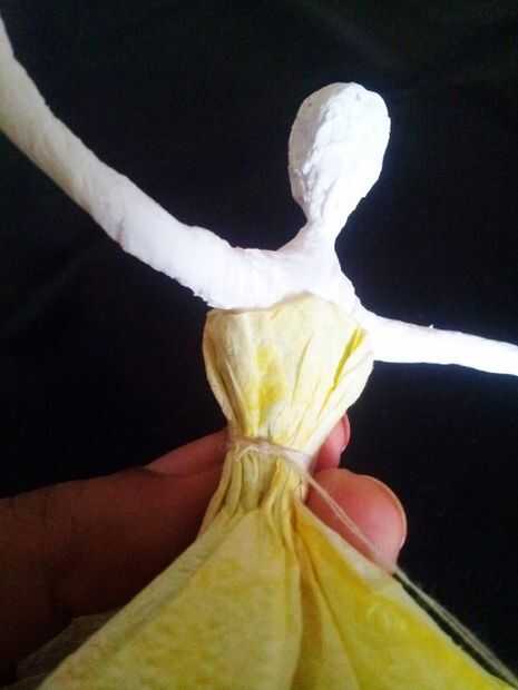 Poner el cuerpo a través del orificio. Tirar hasta el vestido bajo el brazo. Recoger apretado y envolver con hilo y un nudo. El vestido debe tener encima, pero sólo en caso de que no que siempre puede dab un poco de pegamento debajo de la blusa.