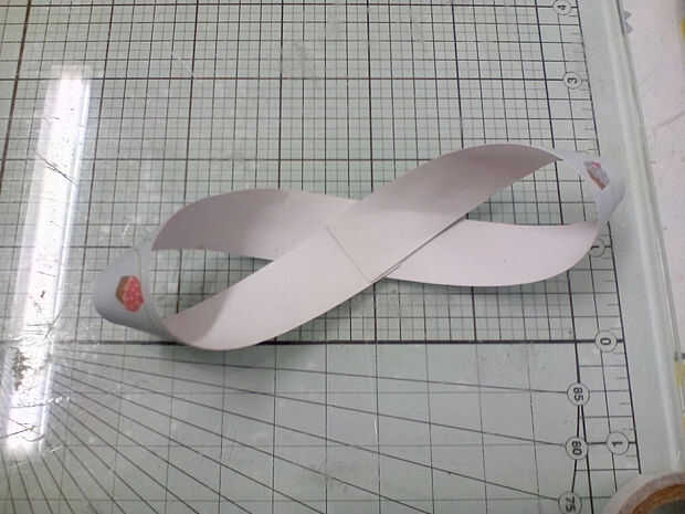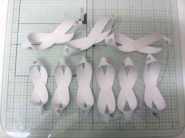 Enrosque cada tira en una figura de ocho como se muestra. Llevando a cabo la tira en el centro, doblar un extremo redondo dos veces y seguro en su lugar con doble cara cinta adhesiva o pegamento. Repita con el otro extremo. Hacer esto para todas las bandas excepto el más pequeño dos.
