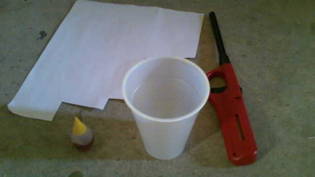 se necesita: colorante amarillo, agua (no en la foto), un contenedor para mezcla (uso de cualquier tamaño es necesario para cualquier pieza de tamaño de papel que está utilizando) papel (Duh) y una encendedor de barbacoa.