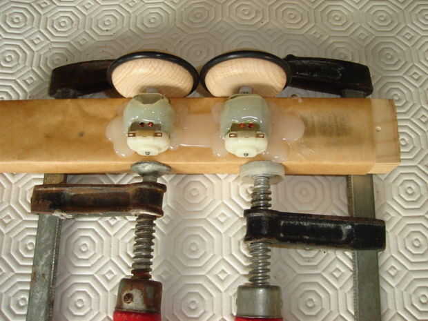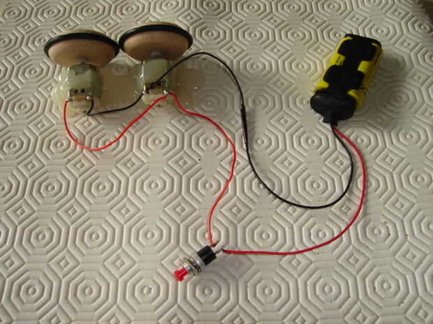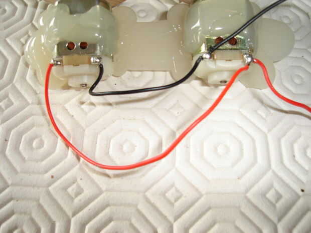 Soldar los cables como se muestra en la cuarta foto. Tenga en cuenta que los motores están conectados en paralelo, pero con polaridad opuesta (tienen que girar en dirección opuesta). El sentido de rotación de la combinación puede ser corregido con la polaridad de las baterías, por lo que no necesitará preocuparse por eso, en esta etapa.
