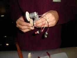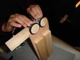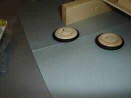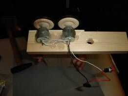 Por el montaje de adaptadores que las ruedas de los motores. Podría necesitarse algunos cuidado de golpear ligeramente con un martillo. Asegúrese de que el otro extremo del eje del motor está descansando sobre una superficie que puede resistir el martilleo. Deje un pequeño espacio entre las ruedas y los cojinetes del motor. Esto es importante que las ruedas gire suavemente. Coloque el conjunto en la construcción de madera como se muestra. Asegúrese de que el punto donde el toque de las ruedas está alineado con la marca de la flecha y que las ruedas pueden moverse libremente sobre el tablero de madera contrachapada. Pegamento en esta posición con el pegamento de su elección evitando cualquier agujeros y rodamientos de los motores. Recomiendo usar pegamento. Usted simplemente puede aplicar algunas gotas en los bordes del pegamento caliente del derretimiento, donde toca la madera y deje que el pegamento en remojo. En un taller, después de la advertencia a los niños para que no pegue a los dedos, los tengo con el montaje en posición y recorrer con mi pegamento. Con los niños más pequeños yo aplicarme las gotas de pegamento.
