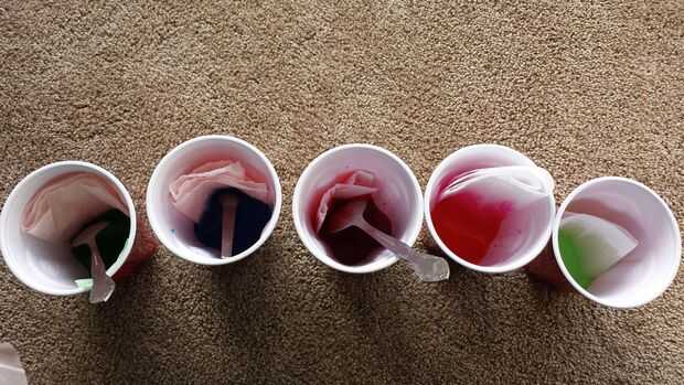 Tenía un paquete de Koolaid que quería probar; del mismo modo se puede utilizar gelatina u otro en polvo colorantes. Se ha añadido el paquete completo para 1/4 de taza de agua antes de sumergir un papel y poco a poco sumergirse más de lo mismo (15 minutos por 1 pulgada). También probé una mezcla estándar de colorante rojo para la comparación. El Koolaid dio el papel una mancha roja bonita agradable con un ombre ligero fundido; mucho más oscura y más fuerte que el colorante de alimento rojo, que resultó rosa en lugar de rojo y no mostrar un fade ombre en todos. El olor cereza el Koolaid pegar al papel (huele más como malvaviscos), aunque no había ninguna adherencia de agentes azucarados.