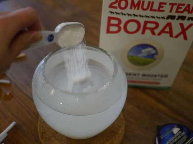 Añadir 100g de bórax al agua hirviendo y revolver hasta que se disuelve completamente!