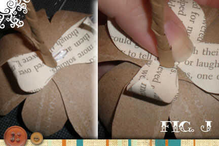 Sacar el eje y pegar la curva en la parte inferior de la flor de la segunda pieza de cáliz y pegar a la parte inferior de flores intercalando el metal curva entre el cáliz y la flor. Será necesario sostener el cable en su lugar hasta que el pegamento seque (fig. J).