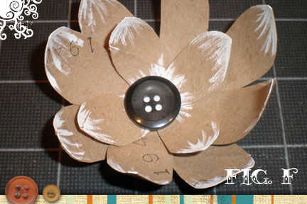 Después de que el pegamento se haya secado, pega las agrupaciones uno encima del otro, manteniendo los pétalos más pequeños para la parte superior. Pegar un botón en el centro de la flor (fig. F).