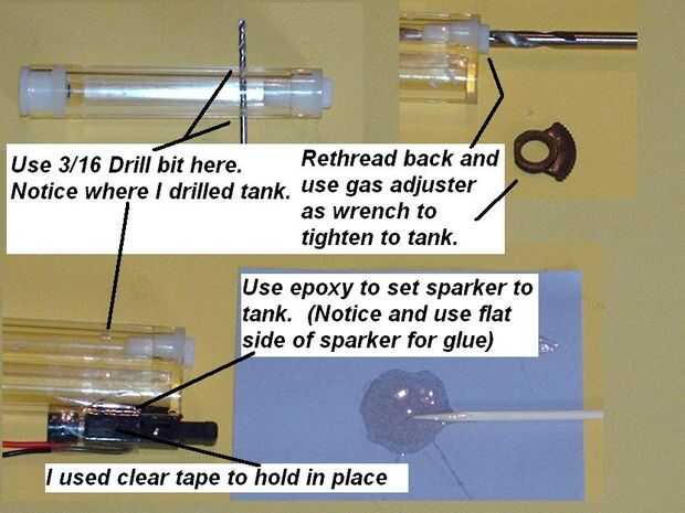 Taladro de 1/16 tanque justo detrás del orificio de escape.  Nota: No perfore a través del recto.  Por cada lado para evitar plast Taladro broca de debree restante en el tanque.  Luego vuelva a enhebrar tapa y utilice el regulador de gas original como una llave para apretar.  Utilice epoxi para fijar a sparker tanque.  Nota: No EPOXY la parte de la bujía que tiene piezas móviles.  UTILICE UN LADO PLANO.
