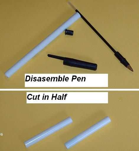 Desmontaje de la pluma y corte el tubo blanco por la mitad.  Se trata ahora de su barril.
