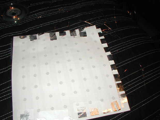 Mientras que suelda normalmente sería la elección prevista para este tipo de contacto, estamos trabajando en el papel por lo no es una opción. Me deslicé a los cables debajo de la lámina y la cinta (no había planeado muy lejos y cubierto el papel allí en cinta) pero podría juse los cables para desnuda hoja de la cinta.