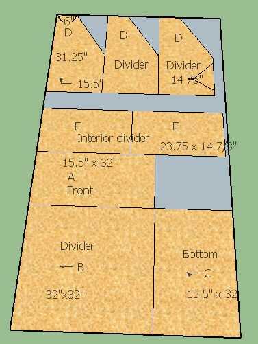 En primer lugar recoger sus desechos para su construcción, ya sea madera o tableros. Si usas placas clavo encima de sus tablas en paneles de tamaño para cada pieza. Es decir si una pieza es 2 x 4' y colocar tablas para hacer un panel de 2 x 4'. Si uso madera, entonces usted puede trazado de las piezas. Sólo podría conseguir el fondo y los lados de la pieza que tenía, así que tuve que mendigar otra piezas de pareja uno para la espalda (pude de tableros usados allí y un pedazo de la dividers.and cortado a la medida.
