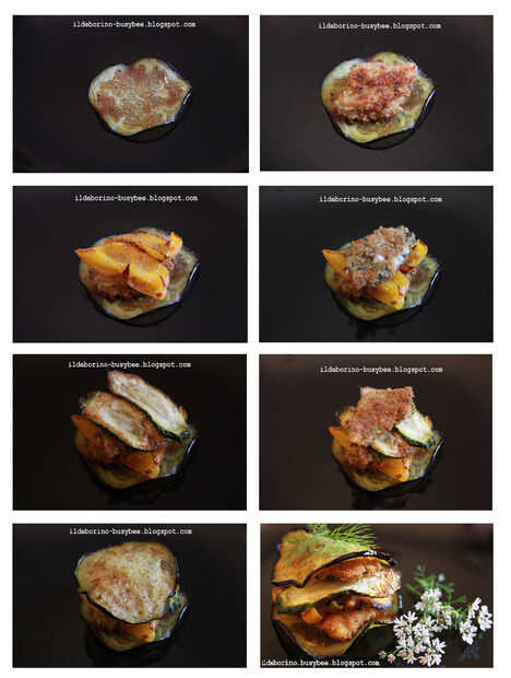 Poner una rodaja de berenjena en un plato para servir, coloque un filete de pescado en la parte superior, y dos rebanadas de calabaza, otro filete de pescado, un par de tiras de pimiento, otro filete de pescado y finalmente una rodaja de berenjena. Decoré con flores de eneldo y cilantro. Servir las verduras y el pescado pilas mientras está todavía caliente, para apreciar mejor los sabores de todos los elementos del plato.