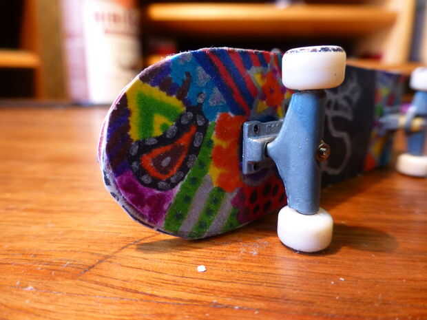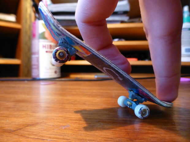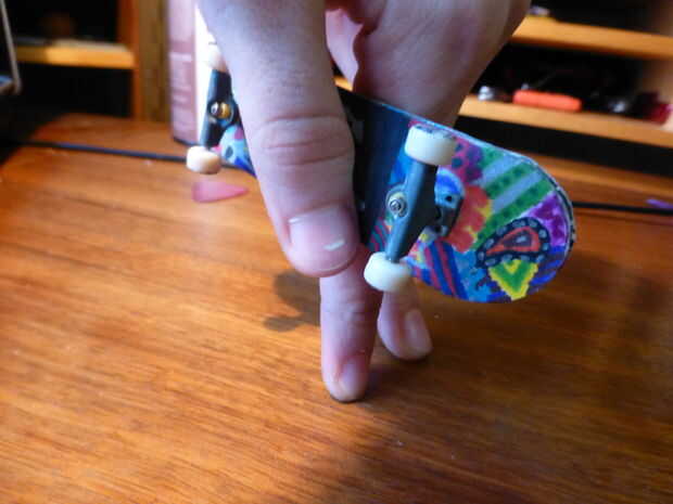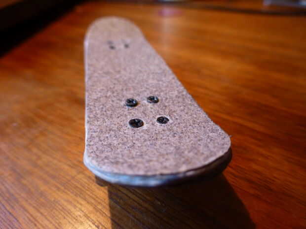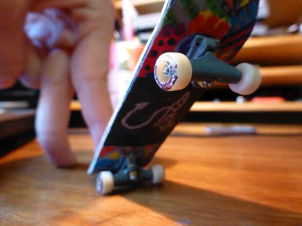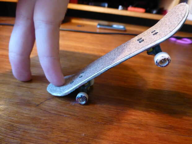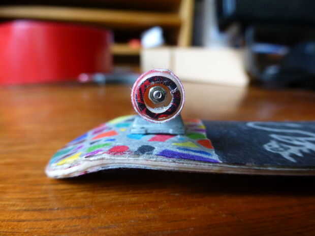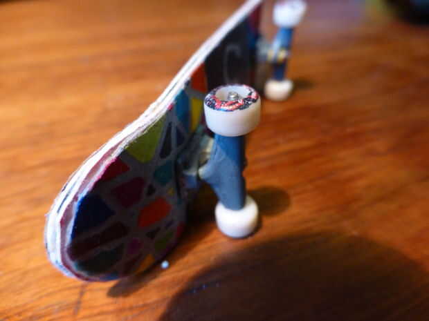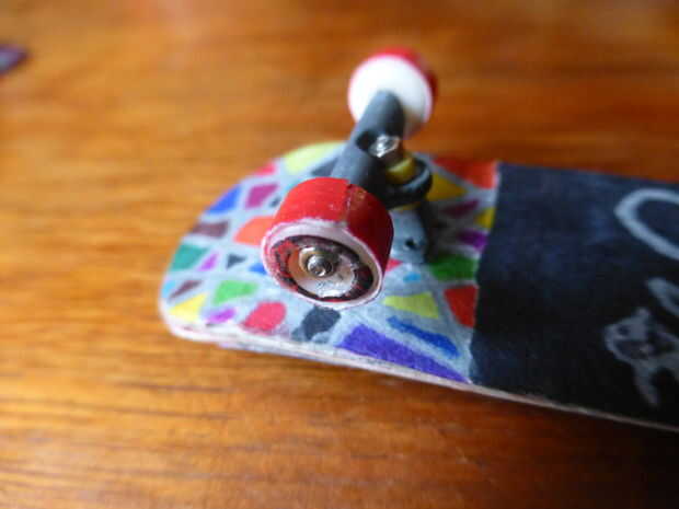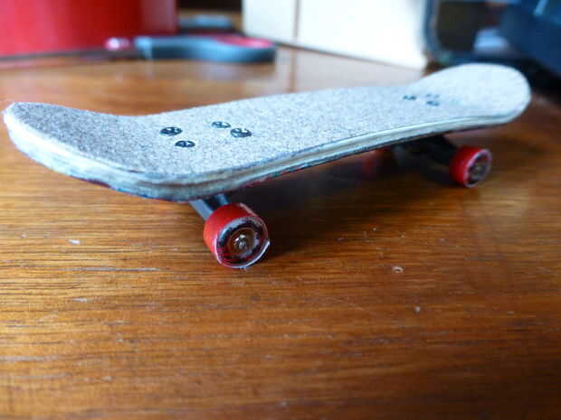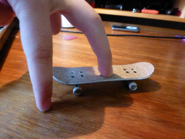ACTUALIZACIÓN: Ya me fingerskate en mi escritorio y la superficie de madera pulida hace las ruedas de todos mi slip boards, envuelve las ruedas en este tablero con tiras de cinta adhesiva para crear fricción. Crea una sensación muy diferente (un poco más como las ruedas del monopatín real) pero me parece bien. La cinta es fácil de conseguir en y apagado y ahora mismo no tengo la cinta (sólo porque no me siento que). Puedes ver las ruedas envueltas en las imágenes de fondo.