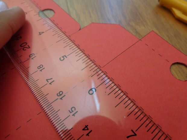 Para este paso, agarrar su regla y su herramienta de puntuación. Las líneas es simplemente alinear la regla paralela a las líneas y luego correr la punta de la herramienta a lo largo de la línea mientras se aplica presión. El resultado crea una ligera impresión en el papel, que hace pliegues rectos y agudos. Hago esto para todos los modelos.