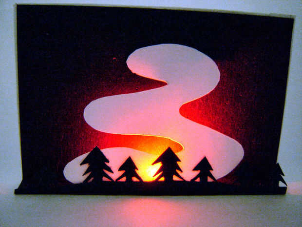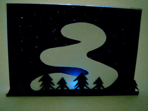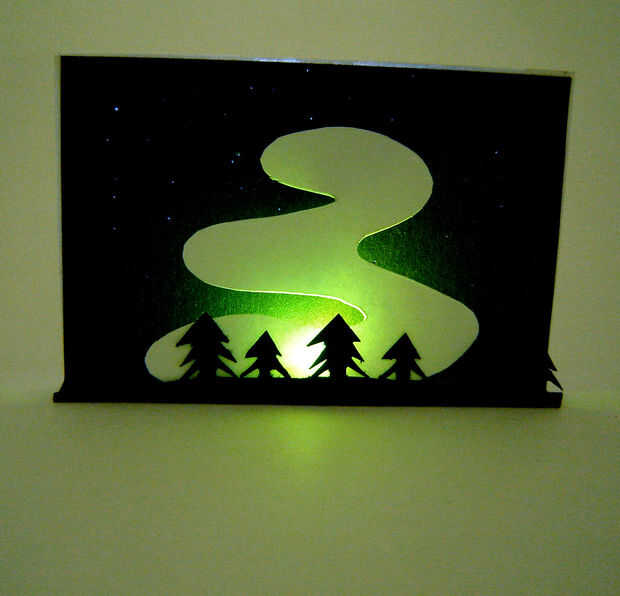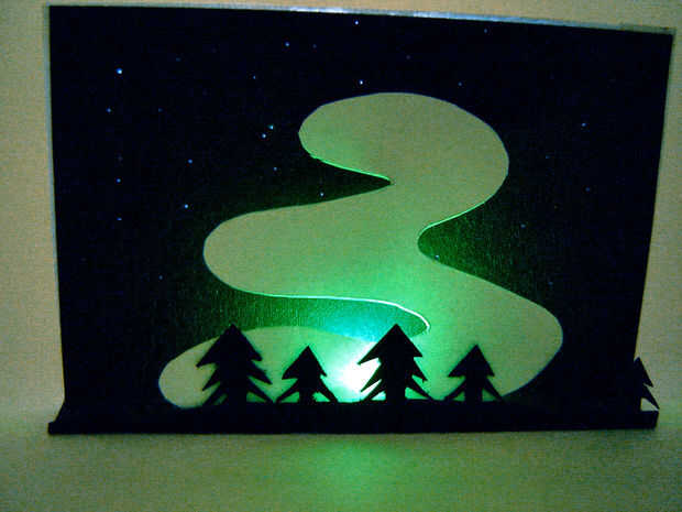 Corte el color cambiar LED proyectos contra un blanco de la Aurora sobre un fondo negro. Hay pequeños agujeros en el fondo con un LED blanco en la espalda para dar la apariencia de las estrellas. Cuando estaba buscando en imágenes de la Aurora Boreal en Google muchos de ellos presentaban los árboles en primer plano por lo que he añadido algunas siluetas de árboles para que se vea más auténtica.