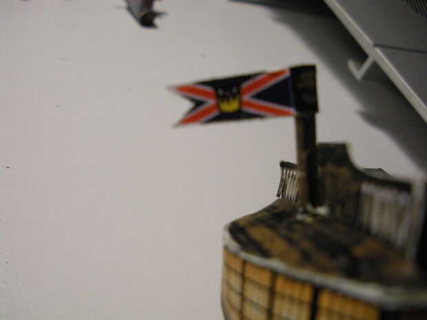 Tercer pegue un largo a la parte inferior de la pieza 30 y otro a la parte superior de la asta de la bandera.