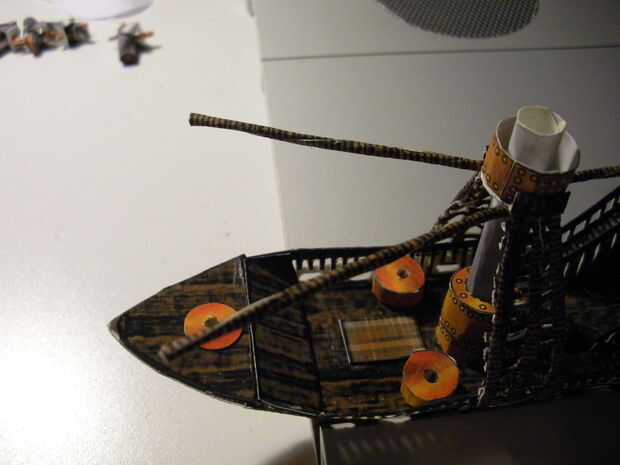 En cuarto lugar pegar las 2 piezas más cortas en la parte inferior de 30 al lado de la escalera. déjelo secar. luego pegar al casco como señalado en la tercera imagen abajo.