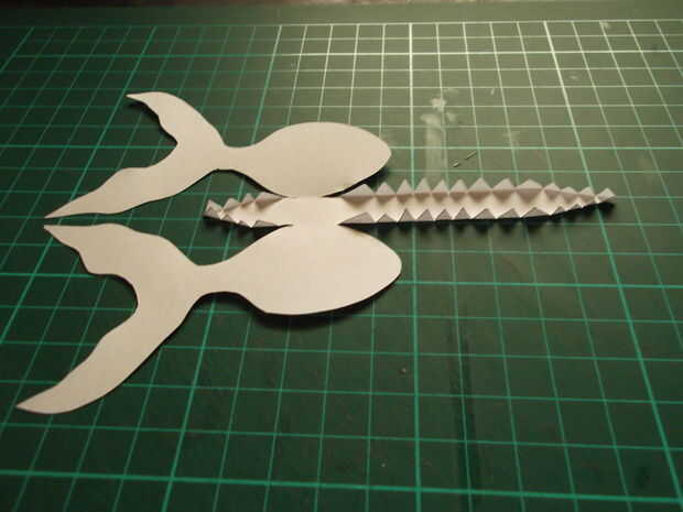 Tomar el cuerpo de los peces de colores y doble las aletas de triángulo de 90 grados hacia el lado blanco del papel.