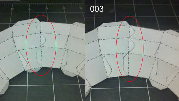 Anotar todas las líneas punteadas y doblarlas. Las líneas de puntos debe ser doblada mientras que las líneas de dash-dot-rociada deben ser doblado de Valle de la montaña. Un pliegue de montaña es una donde el papel está doblado lejos de la línea para hacer una "montaña", y el doblez de Valle es lo contrario. Foto 001, la pieza de la derecha tiene una serie de pliegues de la montaña, y la pieza de la izquierda tiene dobleces de Valle.