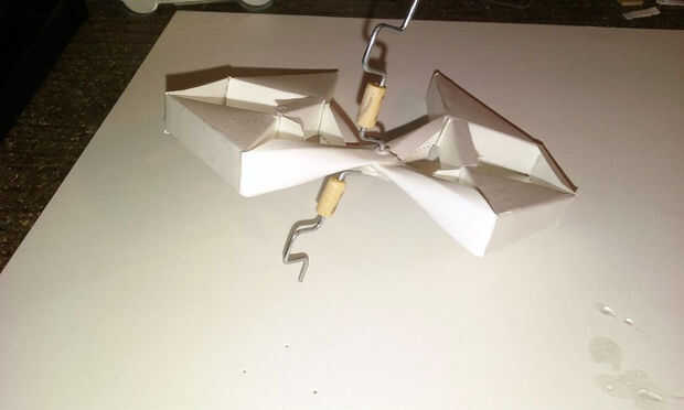 Tome dos de las seis piernas y deslizar los puntos de anclaje de cuatro (dos por brazo) en la pieza más larga del eje. Asegúrese de que ambas piernas están apuntando en la misma dirección. Ahora puede pegar en la pieza de eje más pequeño en el pedazo más grande del árbol, las piernas dentro del lacre. Otra vez, prestar atención al ángulo cuando pegar el eje de.