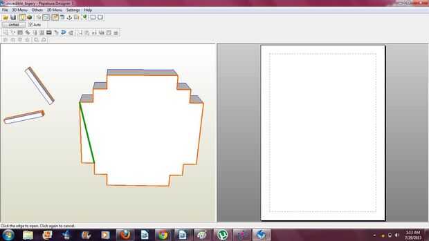 Para comenzar, abrir el archivo .obj o .stl en Pepakura Designer y empezar a editar el modelo. Mediante el icono que parece un cortador de caja amarilla, desea especificar su cantos abiertos. Bordes abiertos son básicamente donde desee el objeto para abrir en.