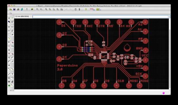 Junta el Arduino Pro Mini esquema puede encontrarse en la Página Web de Arduino. Nuestros archivos Paperduino 2.0 águila finales pueden encontrarse aquí.