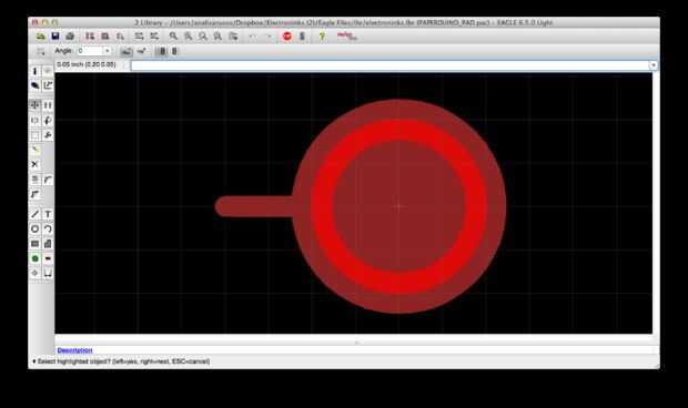 Para hacer el esquema papel respetuoso, reemplazamos los bloques de pines con nuestro propio cojín redondo personalizado. Por-agujero componentes tales como las cabeceras de pin son difíciles de utilizar en superficies flexibles como el papel. Hemos añadido el nuevo diseño de la almohadilla a la biblioteca de componente Electroninks. Dado que el trazador de pluma sólo imprime líneas, pero no patrones de relleno, las pastillas fueron compuestas de círculos concéntricos superpuestos. La trayectoria de la herramienta para el trazado aparecerá en el paso 3.