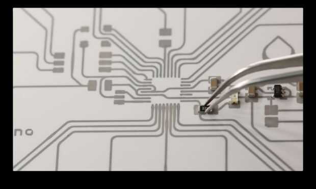 Coloque una gota de pegamento entre las almohadillas del componente. Es aceptable si el pegamento entra en uno de los rastros que discurre entre las almohadillas. Luego coloque cuidadosamente un componente con pinzas y prensa en el centro.