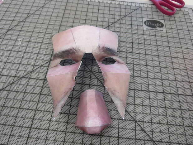 Unir las lengüetas como dictada por las ilustraciones. Empecé con la frente y había añadido a cada una de las mejillas. Luego le puse en la nariz, comenzando con el pedazo de centro superior y trabajó todo el camino.