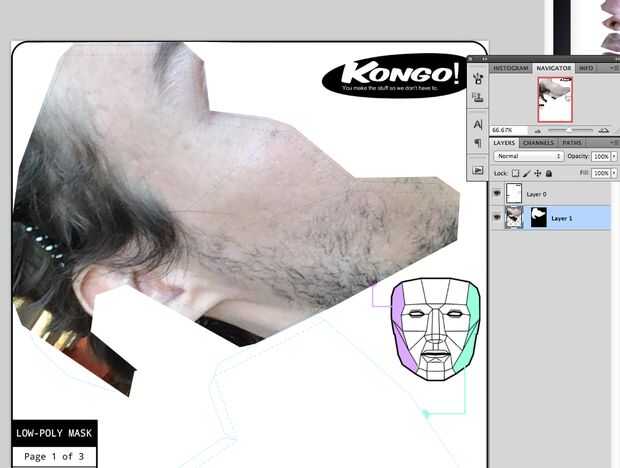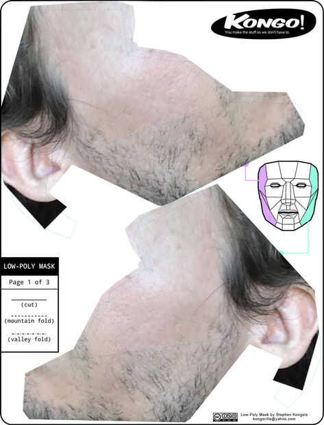 Use la ilustración de kongorilla como referencia. El oído debe alinearse alrededor del gancho, el ojo en la esquina del polígono más grande y la boca apenas sobre el polígono de más abajo. No tiene que ser perfecto, sólo tratar de evitar