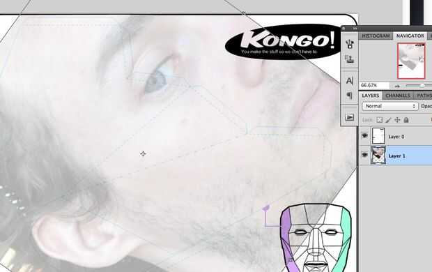 Coloque su cara hacia la parte superior de tu lienzo. Transformación libre (comando T) para rotar y escalar desde las esquinas para montar sobre las líneas correspondientes. Puede bajar la opacidad de la capa de la cara para ver mejor las líneas.