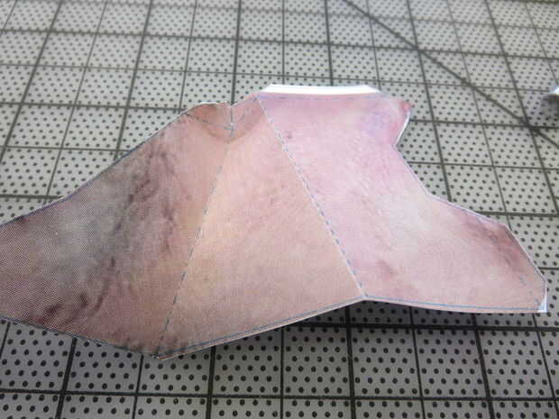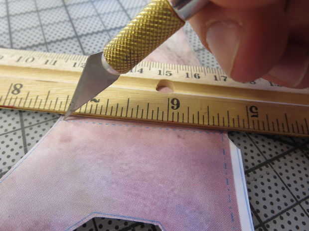 Esta parte sólo es necesaria si usted quiere un Roboto Sr. trianguladas mirar a la cara. Se trata de alinear una regla a lo largo de las líneas discontinuas y punteadas y usando el lado embotado de un exacto o tijeras para anotar a lo largo de las líneas. Aplique presión constante, pero no cortar a través del papel.