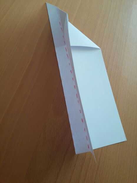 Ahora falten sie die rechte Hälfte (Die mittlere Faltung trennt das Blatt en Hälften 2) así que nach unten das der Abstandt von der Kante unten und der Faltung des Flügels ungefähr 1 cm oder ein bisschen mehr lectura.
