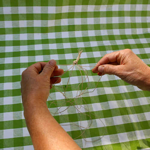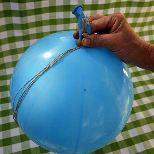 2. para atar lo mantenga juntos cadenas suelto termina juntos y tire de ellas a través de un bucle, tratando de mantener los extremos cerca del nudo como muestra la imagen a continuación. Ahora toma el balón y saltar otra vez con la cuerda envuelta alrededor de él. Sosteniendo el nudo en la parte superior, soplo el globo que las cuerdas no moverse demasiado en sus propias, pero lo suficiente para que pueda ajustar a hacer estrecho lazos alternados alrededor del globo.