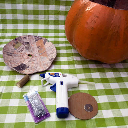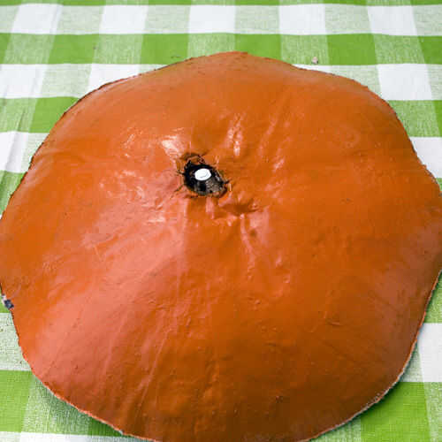 3. a continuación, pegué un clavo pequeño en cartón de la parte superior de la parte superior donde ya había un agujero para marcar donde se debe colocar el vástago. Tire el clavo de nuevo, vuelta el top sobre y centro y la lavadora en el centro antes de pegarse el clavo a través de la parte inferior de la cola. Línea de su madre para que la uña se va por el medio. Usted puede empujar el vástago en el clavo con la mano o que tenga para darle un leve golpecito con un martillo; ya sea cierto debe agregar pegamento caliente por debajo de la espiga antes de empujarlo para fortalecerlo.