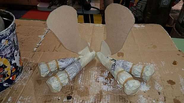 Bandas de goma fueron utilizados para sostener las "articulaciones del dedo del pie" en la forma deseada. Los dedos del pie eran envueltos en periódico otra vez antes de la arcilla de papel se aplica. Poner una capa de periódico antes de aplicar el papel maché fue hecho para proporcionar una superficie que se pegaría el papel maché para. He encontrado que el papel maché no se adhiere bien a la superficie brillante del pasteboard o cinta adhesiva.