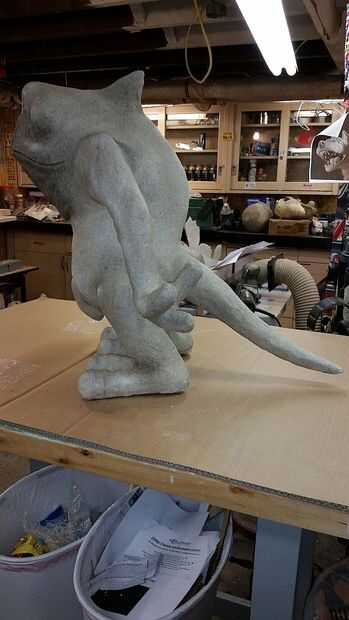 En este punto he desarrollado un problema con la posición de la figura. Como puede verse observando la cola en la imagen, la figura empezó a inclinarse hacia adelante. Aunque la figura estaba sentada bien equilibrada antes de la arcilla de papel se aplica, había más en el frente y la espalda y cuando está mojado agrega una cantidad considerable de peso en la parte delantera. Esto causó la figura a inclinarse adelante y la cola para levantar del suelo. Me basé en el alambre en las piernas para soportar el peso, lo que hizo, pero no lo vinculo en los pies y doblado hacia adelante en los tobillos.