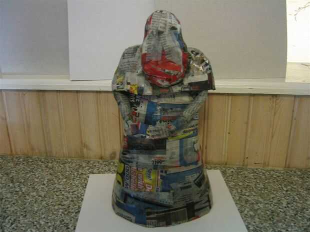 En tubos de periódico para los brazos pegan a los lados con pasta de papel pintado, luego cubierto periódico tiras sobre los hombros de un cabo.  La cabeza era un balled pedazo de periódico pegado encendido con más pasta, y luego tiras sobre él de la forma de la barba.